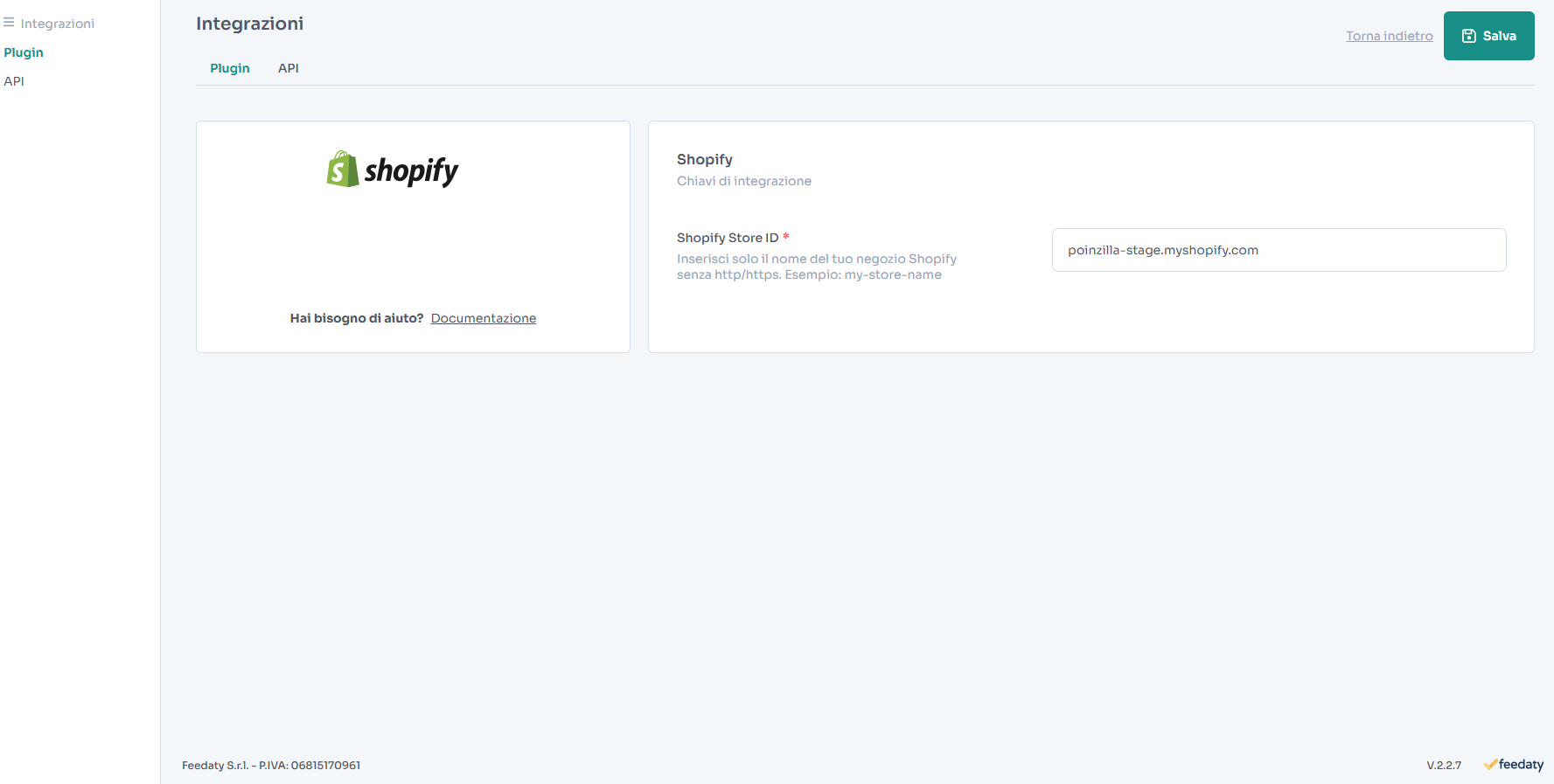 Vai su Poinzilla > Integrazioni > Shopify e inserisci il tuo store name di Shopify, senza il prefisso https:// .